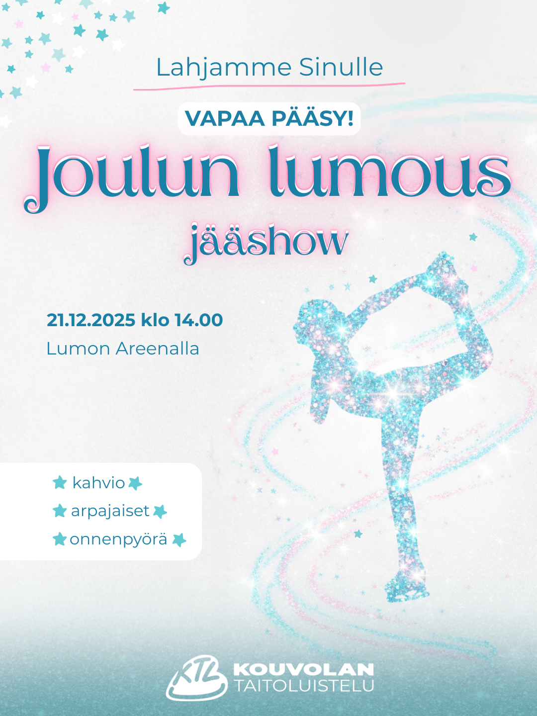 Tervetuloa viettämään jouluista iltapäivää taitoluistelun parissa! Kouvolan Taitoluistelu kutsuu sinut Joulun lumous -jääshow’hun sunnuntaina 21.12.2025 klo 14.00 Lumon Areenalle. Näytös on seuran…