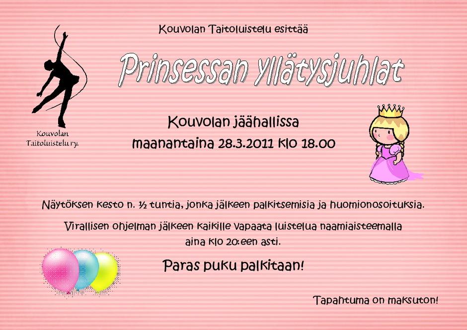 Kouvolan Taitoluistelun kevätkauden päättäjäisiä vietettiin maanantaina 28.3.2011. Päättäjäisten yhteydessä kaikki seuran luistelijat esittivät upean luistelunäytöksen, Prinsessan yllätysjuhlat, jonka jälkeen juhlia jatkettiin naamiaisluisteluteemalla. Prinsessan juhlissa oli mukana mm. ilmapalloja, barbeja, satuhahmoja, karamellejä sekä paljon muita vieraita. Jäällä nähtiinkin hienoja naamiaisasuja sekä valtavasti luistelun riemua.