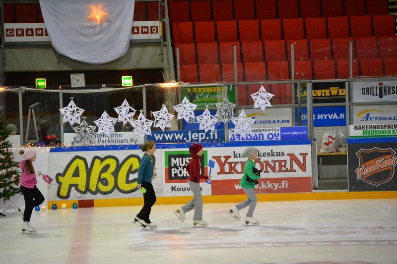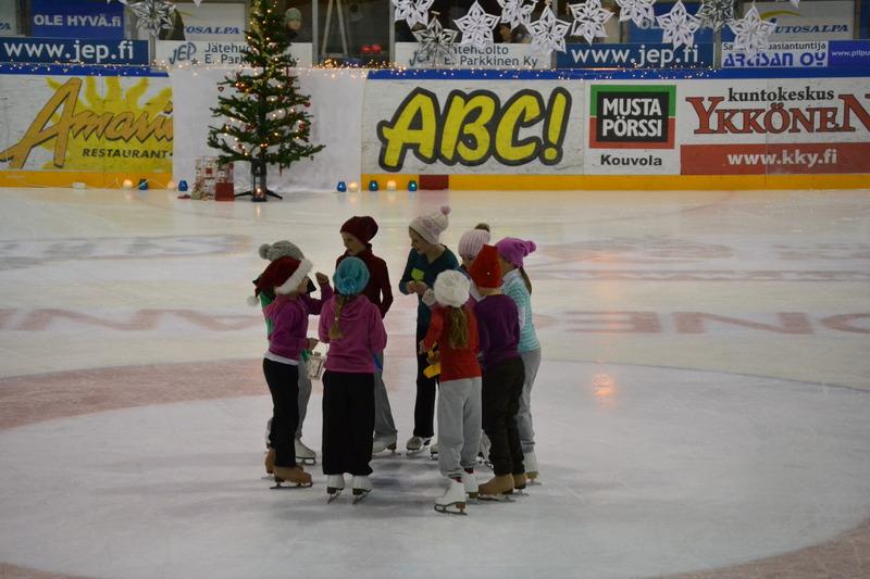 Kuusankosken luistelukoululaisia tonttupolkan pyörteissä